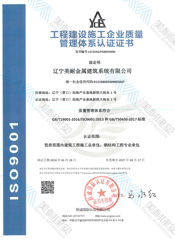 辽宁美耐金属建筑系统有限公司位于辽宁(营口)沿海产业基地,专注于预制金属建筑系统领域,是一家集工业建筑设计、制作、施工及相关的技术咨询与服务为一体的综合性服务企业。作为国家钢结构协会会员、中国建筑金属结构协会会员单位与国家高新技术企业,美耐建筑集建筑工程施工总承包、钢结构工程专业承包等多种资质于一身,并拥有22项钢结构建筑领域专利,9项软件著作权。